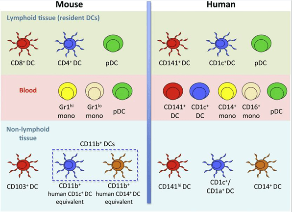 - Conventional/classical DCs, consisting of two subsets: CD1c+ DCs (mouse: CD4+ DCs) and CD141+ DCs (mouse: CD8+ DCs).