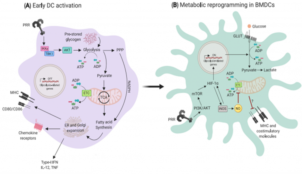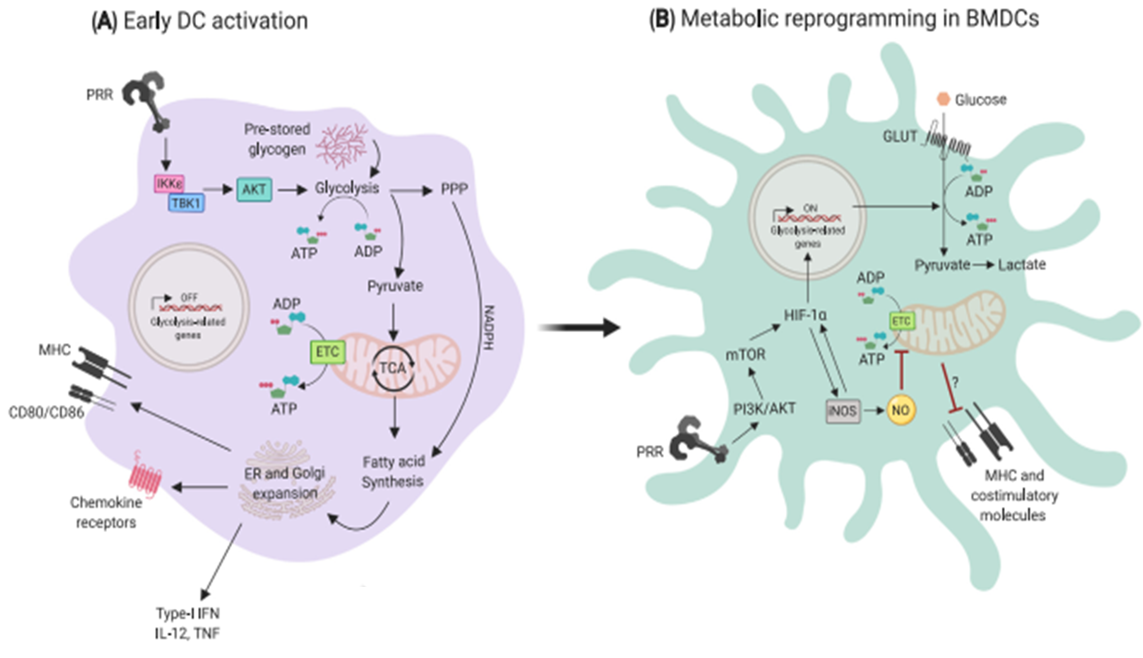 - Early glycolytic reprogramming in DCs increases the concentration of crucial metabolic intermediates that are essential for anabolic processes to sustain the production of DC activation-related molecules. These leads to increased concentrations of pyruvate that can be shuttled into the tricarboxylic acid (TCA) cycle for the production of citrate (Figure 3).