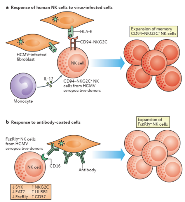 - Memory NK cells have been reported in individuals who have previously encountered human cytomegalovirus (HCMV). These memory NK cells have been defined by the expression of activation CD94-NKG2C receptor.