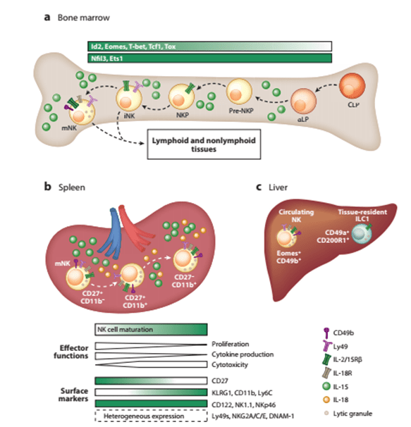 - NK cell development occurs in the bone marrow (BM) from common lymphocyte progenitors (CLP) and their development depends on IL-15, which induces the expression of transcription factors such as Nfil3, Id2 and Eomesodermin (Eomes). IL-15 is also involved in their survival and innate effector functions by regulating their metabolism. After their early stages of development, NK cells continue their maturation in the BM and then in the periphery, expressing different transcription factors, surface and effector molecules. Mature NK cells can be found in lymphoid and non-lymphoid organs like peripheral blood (PB), a characteristic that distinguishes them from other ILCs.