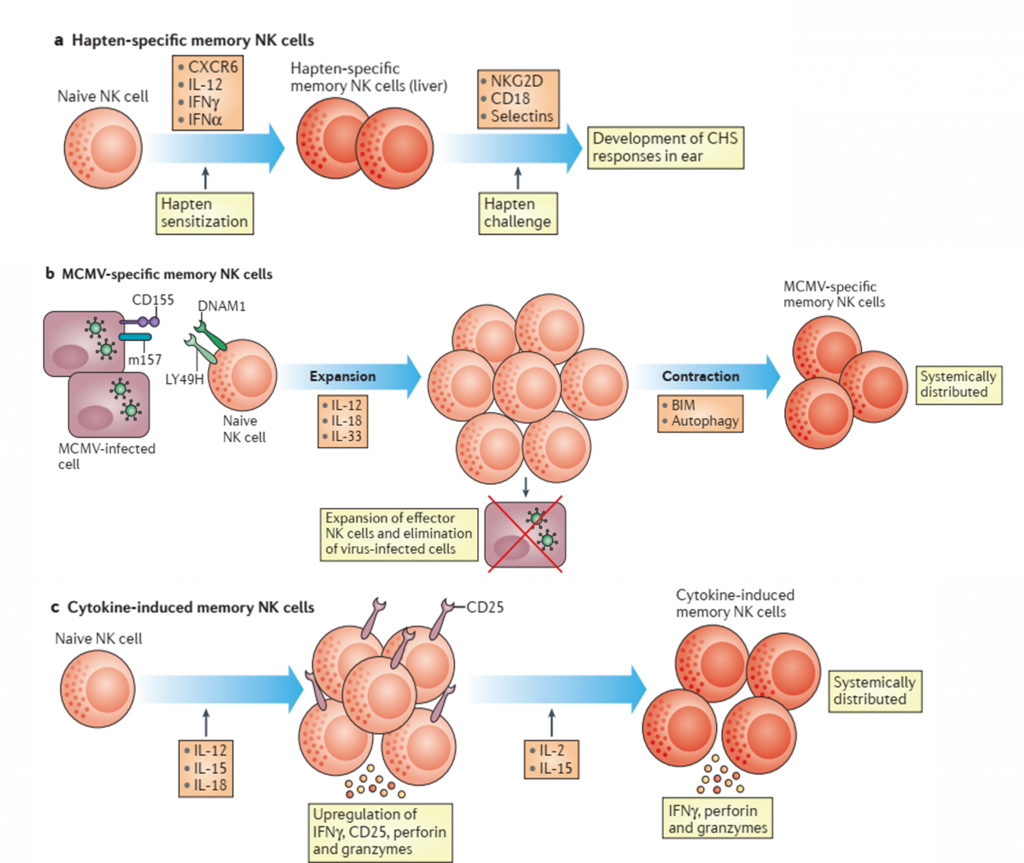 - As has been mentioned “innate immune memory” cells are characterized by their ability to rapidly expand and respond by increasing production of effector molecules after a re-encounter with a pathogen. Memory NK cells have been demonstrated to produce higher levels of IFN-y in comparison to naïve NK cells after MCMV re-infection but not with heterologous pathogens in mouse models. Another characteristic that distinguishes memory NK cells from naïve NK cells are the stable epigenetic changes. The expansion of CD94-NKG2C human NK cells and their robust cytotoxic response has been reported in HCMV-seropositive individuals. These cells also exhibited epigenetic changes such as a demethylated CNS1 region in the IFNG locus.