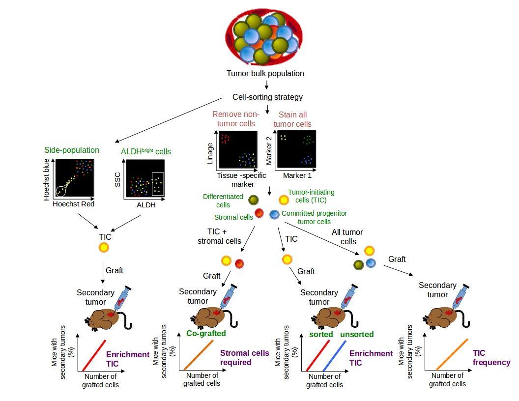 Figure 7. The tumor propagating assay to evaluate CSCs properties. To assess tumour-propagating potential, different populations of tumour cells are isolated by flow cytometry and transplanted into immunodeficient mice. A combination of a tissue-specific and lineage-negative (LIN−) markers allows the isolation of tumour cells, which can then be separated in different subpopulations on the basis of cell surface marker expression or enzymatic activity. Transplanting limiting dilutions of tumour cells and assessing the fraction of transplanted cells giving rise to secondary tumours allows for the estimation of tumour-propagating cell (TPC) frequency. Subsets of tumour cells giving rise to secondary tumours more frequently than unsorted tumour cells are enriched in TPCs. In certain cases, serial transplantation is required to distinguish a population of tumour cells with long-term self-renewal potential. Finally, some tumour cells may not form secondary tumours in the absence of stromal cells, owing to their strong dependence on the microenvironment. Transplantation constitutes a good approach to determine whether certain tumour cells have long-term self-renewal properties, as well as the capacity to generate all the cell types that are found in primary tumours. However, this method does not indicate whether TPCs are responsible for tumour growth within the primary tumours. [Modified from Beck and Blanpain 2013]