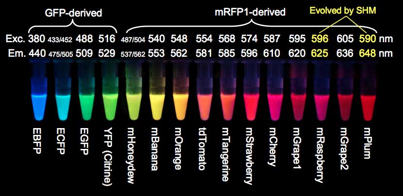 Figure 2. Monomeric and tandem dimeric fluorescent proteins, cloned and modified from Aequorea victoria derived GFP or Discosoma derived RFP. [Tsien, Integr. Biol., 2010]