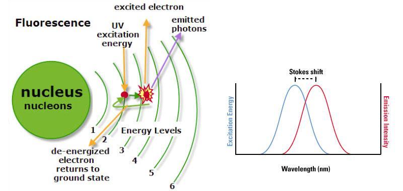 • The difference of the maximum of excitation and the maximum of emission wavelength is termed Stokes Shift (Figure 1, right).