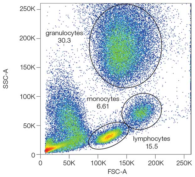 • FSC and SSC can be used to broadly distinguish between different cell types, e.g. in the human peripheral blood. However, this requires much expertise and is far from being precise.