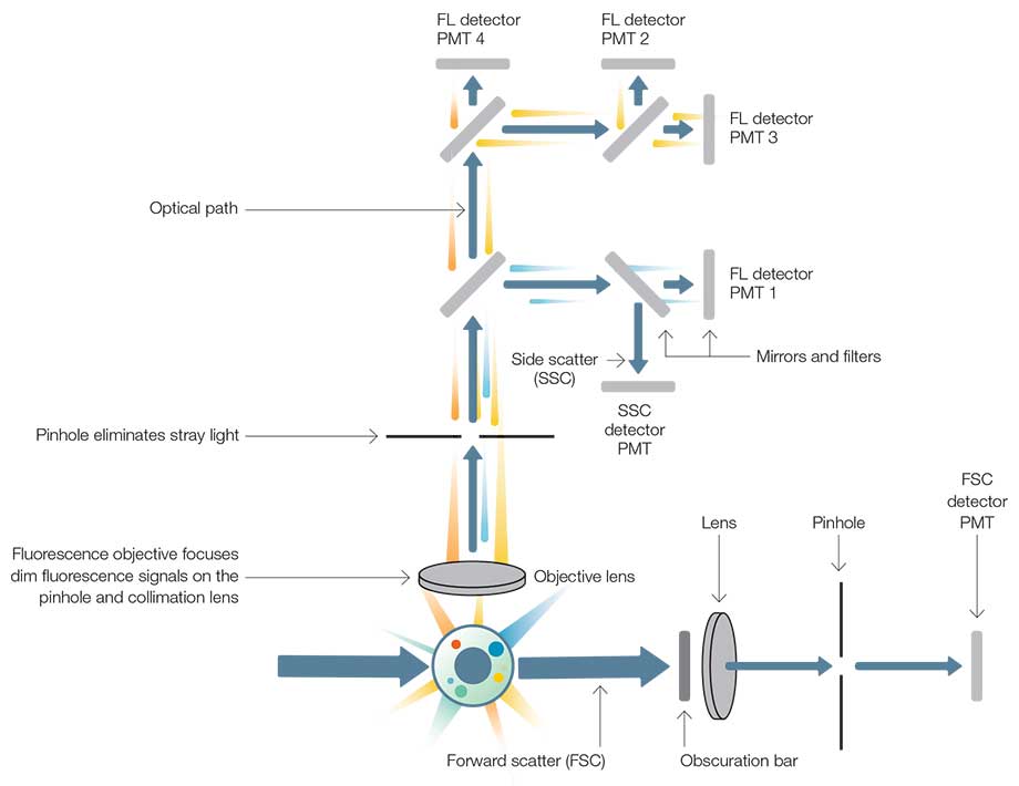 Figure 5. Schematic overview of a typical Flow Cytometer setup. FL, fluorescence; PMT, photomultiplier tube; SSC, side scatter; FSC, forward scatter; blue arrow, light path. [Bio-Rad Flow Cytometry Basics Guide]