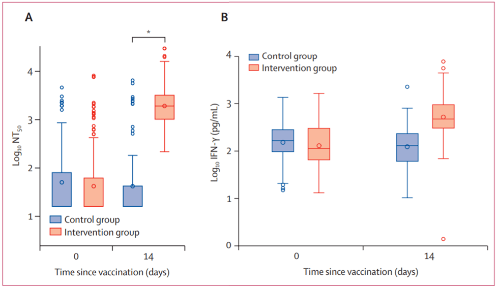 - In a phase 2 trial testing, Borobia et al. demonstrated that BNT162b2 given as a second dose in individuals vaccinated with AZD1222 induced a robust immune response, with an acceptable and manageable reactogenicity profile. Additionally immune responses in the heterologous vaccination arm had significantly higher levels than control vaccination arm (Figure. 4)