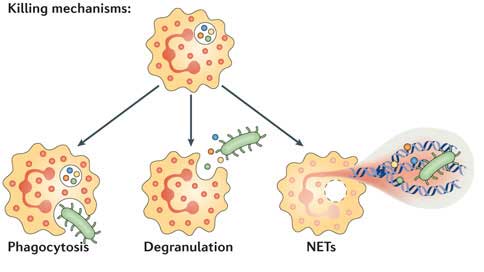 In tissues, neutrophils can promote the killing of pathogens by three main mechanisms: