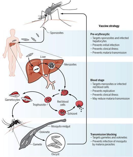- Three types of vaccine strategies are being attempted (Figure 1): pre-erythrocytic vaccines, blood stage vaccines and transmission blocking vaccines.