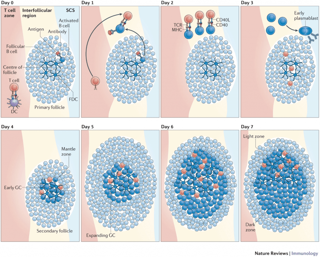 - One of the fundamental pathways needed for the Germinal Center (GC) reaction is the interaction between activated follicular helper CD4 T (Tfh) cells and B cells, highlighted in Figure 2. Tfh cells are essential for the GC reaction as they play a role in increasing the efficiency of antibody responses.