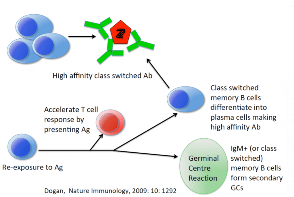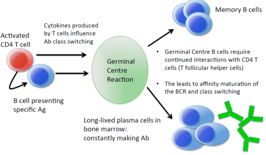 Germinal centers (GCs) are transiently formed structures within B cell zone (follicles) in secondary lymphoid organs – lymph nodes, ileal Peyer’s patches, and the spleen – where mature B cells are activated, proliferate, differentiate, and mutate their antibody genes. GCs play an essential part of where antibody-associated memory is generated.