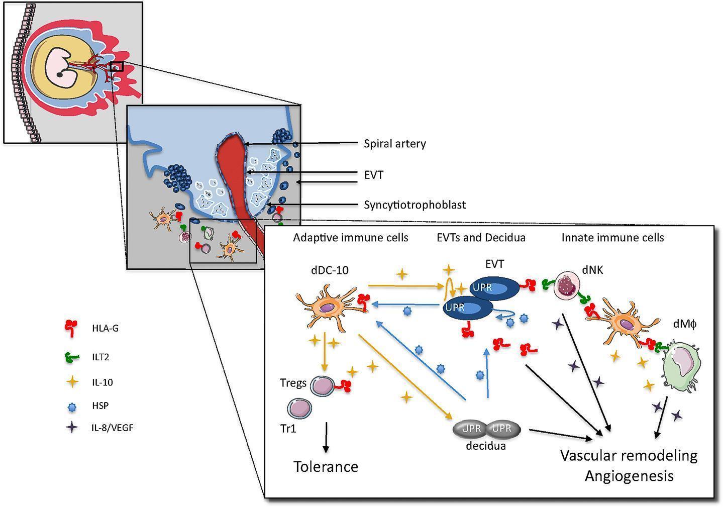 • dDC-10 is HLA-G+ and can interact with either dNK cells or decidual macrophages via ILT2 and promotes their activation and pro-angiogenic effects