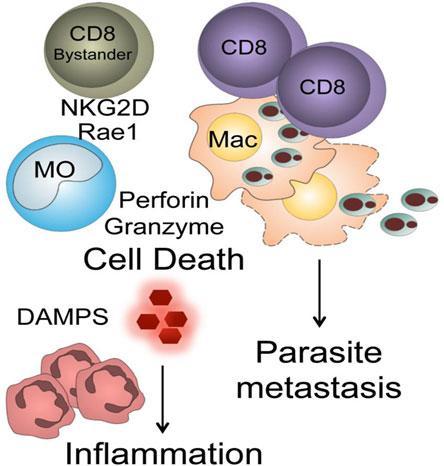 Parasite specific CD8+ T cells infiltrate the lesions, lyse parasitized cells resulting in the release of proinflammatory molecules, including some with damage-associated molecular patterns (DAMPS). Lysis of infected cells liberates parasites and this may promote increased metastasis. Leishmania infection results in upregulation of NKG2D ligands. If by-stander memory CD8+ T cells recruited into the lesions express NKG2D they can lyse target cells resulting in cell death and increased inflammation.