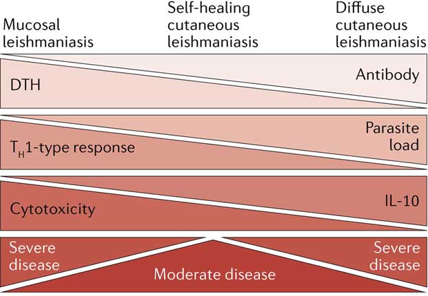 The type and magnitude of the immune response of humans are main contributors to the range of clinical manifestations of CL. The parasite dose, compounds transmitted during natural infection by the sand fly vector into the skin of humans and the presence of a double-stranded RNA-virus in some Leishmania species have also been shown to impact on the severity of human CL.