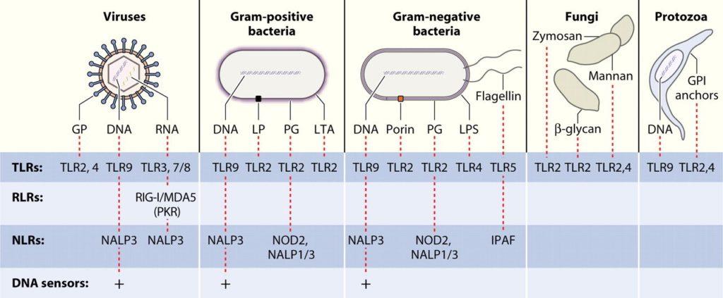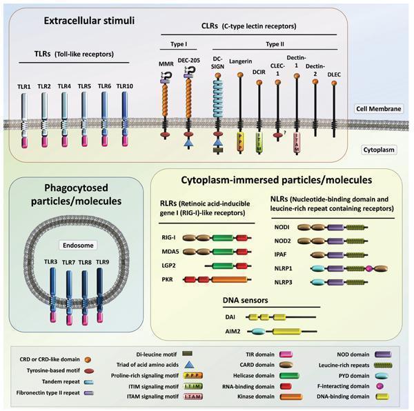 Figure 1: Pattern recognition receptors (PRRs) [Miyaji, EN et al, Trends in adjuvant development for vaccines: DAMPs and PAMPs as potential new adjuvants. Braz. J. Med. Biol.Res. 44(6):500, 2011]