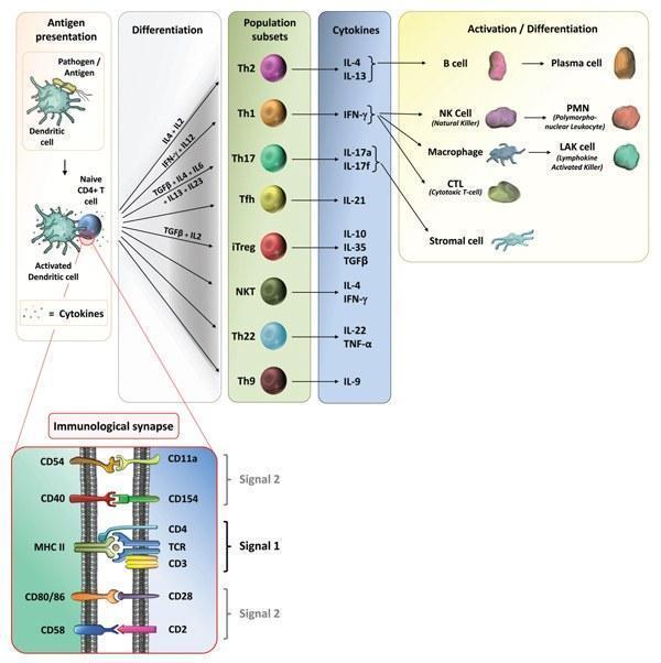• Depending on the interaction of the antigen presenting cell with the T cell, and the context of antigen presentation (MHC class I or II-signal 1 of T cell activation), will be the shape of the adaptive immune response induced. The expression of specific co-stimulatory molecules (signal 2 of T cell activation) and secretion of cytokines (signal 3 of T cell activation) imprints the differentiation signature of T cells (Figure 5). The adjuvant molecule mainly modulates signals 2 and 3.