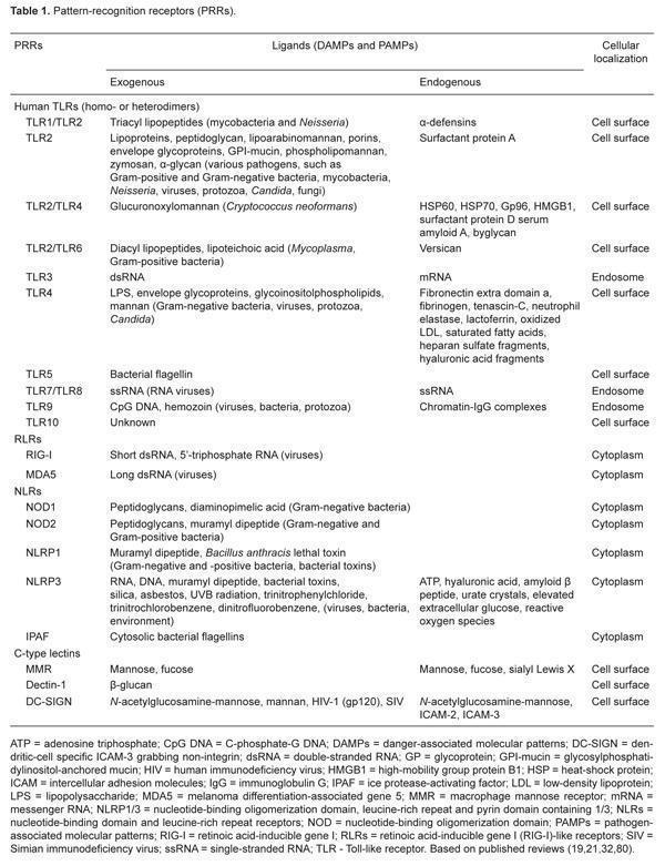 Table 1: PRRs ligands of endogenous or exogenous origin [Miyaji EN et al, Trends in adjuvant development for vaccines: DAMPs and PAMPs as potential new adjuvants. Braz. J. Med. Biol.Res. 44(6):500, 2011]