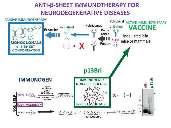 - The active vaccination with the p13Bri immunogen produced a significant cognitive rescue, lower pathology and no vascular side effects in many different AD transgenic (Tg) animal models, including those prone to vascular pathology. The production of monoclonal Ab with the same type of immunization produced families of anti-β-sheet conformational monoclonal Abs (aβComAb) that recognize all kind of pathologic oligomers present in AD and other NDDs. Some of the aβComAb, including IgM, showed a good penetration of the blood-brain-barrier and produced significant cognitive rescue and lower pathological oligomers of both Aβ and tau in old animals of an AD Tg model with flourished Aβ and tau pathologies. No side effects were recorded to this immunotherapy.