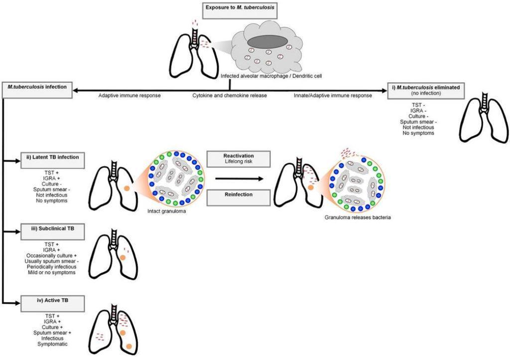 Figure 1: Exposure to Mycobacterium tuberculosis can lead to different outcomes: (i) M. tuberculosis is eliminated by the immune system which results in no infection, (ii) A latent TB infection is characterized by positive diagnosis but no symptoms because no active TB develops, (iii) Sub-clinical disease involves mild symptoms and periodic infectiousness, (iv) An active TB develops [adapted from Moller, M., et al., Genetic Resistance to Mycobacterium tuberculosis Infection and Disease. Front Immunol, 2018. 9: p. 2219.]