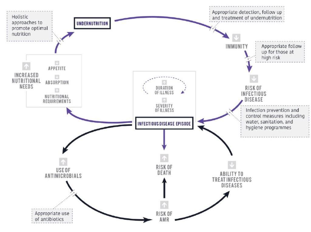 - Promoting optimal nutrition for the integrity and engaging on malnutrition can improve on both disease and AMR rate by using less amounts of antibiotics [9]