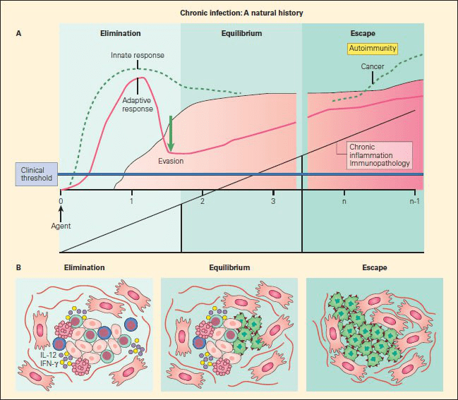 - Failure of elimination of a foreign substance, may lead to a chronic process, i.e. further malignant progression and cancer expansion. It may now be possible to superimpose the “three Es of cancer immunoediting,” i.e., elimination, equilibrium, and escape, upon the three progressive stages of the immune response evolving from innate and adaptive immunity and terminating in the chronic irreversible phase of cancer.