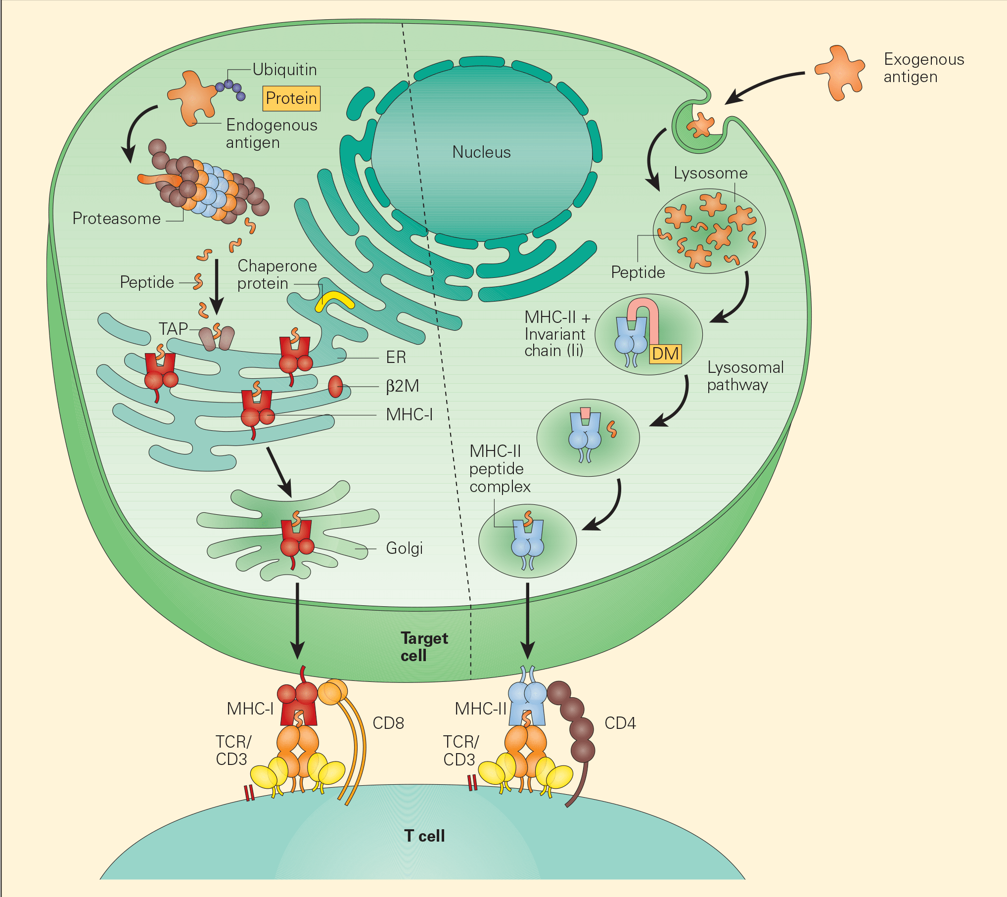 - In the exogenous pathway, APCs, through a variety of endocytic pathways, take up intracellular proteins that have been released from damaged or injured tumor cells. These intracellular proteins can then be degraded in lysosomal pathways to peptides that, when complexed with MHC-II on the cell surfaces, are presented to CD4+ T cells.