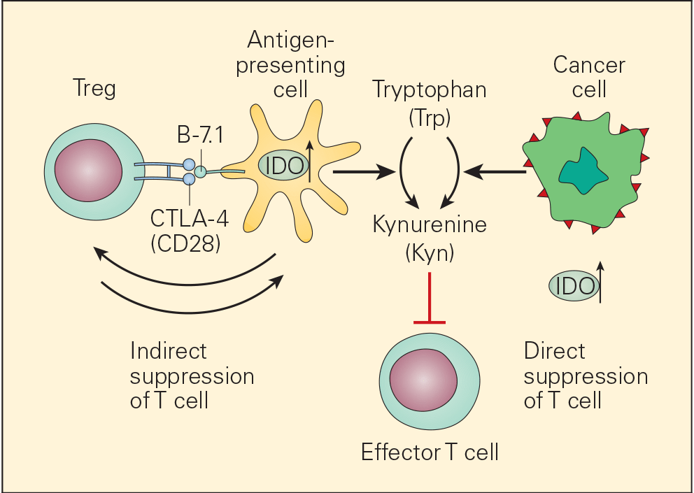 - One of the many factors that promote immune escape and tumor growth in cancer cells is activation of the enzyme indoleamine 2,3-dioxygenase (IDO). IDO is an enzyme that converts tryptophan (Trp) to kynurenine (Kyn) and is involved in tumor growth and immune suppression. Shown in Figure 4 is a schematic representation of the roles of IDO in cancer. (Figure 7).