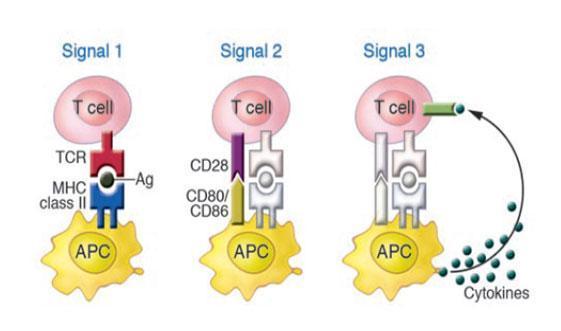 - Signal 3 is produced by the secretion of cytokines by APCs, which signal via cytokine receptors on T cells in order to polarize them toward an effector phenotype as shown in the figure 1. The creation of a particular cytokine environment by APCs during immunity is critical for the determination of the appropriate type of immune response, which can be either cell-mediated or humoral.