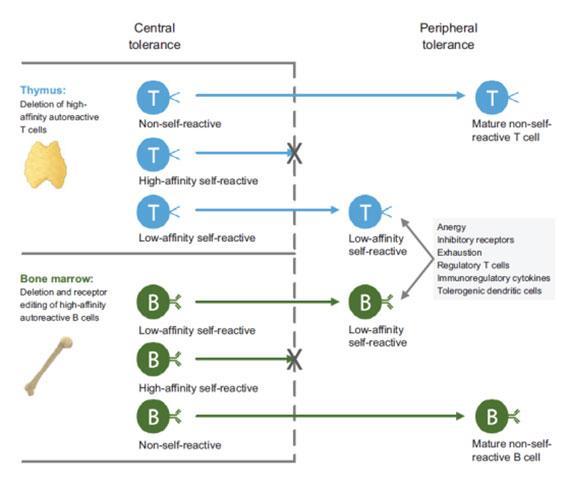 - Low-affinity self-reactive T cells and B cells escape central tolerance and enter the periphery, where they are kept in check by complementary and non-redundant peripheral tolerance mechanisms.
