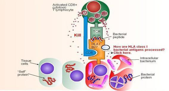 - Figure 4 shows activated CD8+ cytotoxic T lymphocytes recognizing a bacterial peptide presented by HLA-B27 (derived from Immunopaedia case study: 14 year old with severe hip pain)