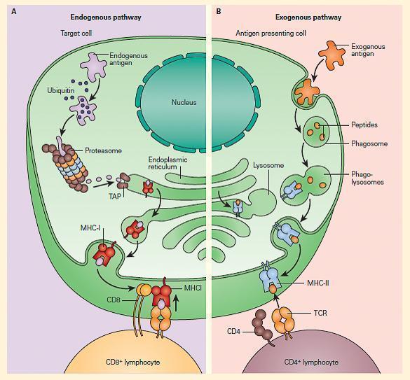 - Other antigens found within cells, e.g., target cells, are processed through an endogenous pathway and are delivered by MHC-I to TCR of ‘‘cytotoxic’’ T cells (CD8+ cells).