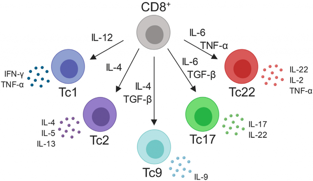- The CD8 T cytotoxic population is the second major group of T lymphocytes that function in killing target cells; they are comprised of Tc1 and Tc2 subpopulations with similar cytokine profiles as Th1 and Th2 cells. CD8 T-cells were originally taken to be one homogenous population of cells, identified by their production of interferon gamma and protease granzyme B, used to execute their main effector function of killing infected cells (St.Paul and Ohashi,2020). Initially characterized as Tc1 and Tc2 cells, CD8 T-cells are now recognized as having several other subsets (Figure 3) that closely mirror what is seen with CD4+ helper T-cells.
