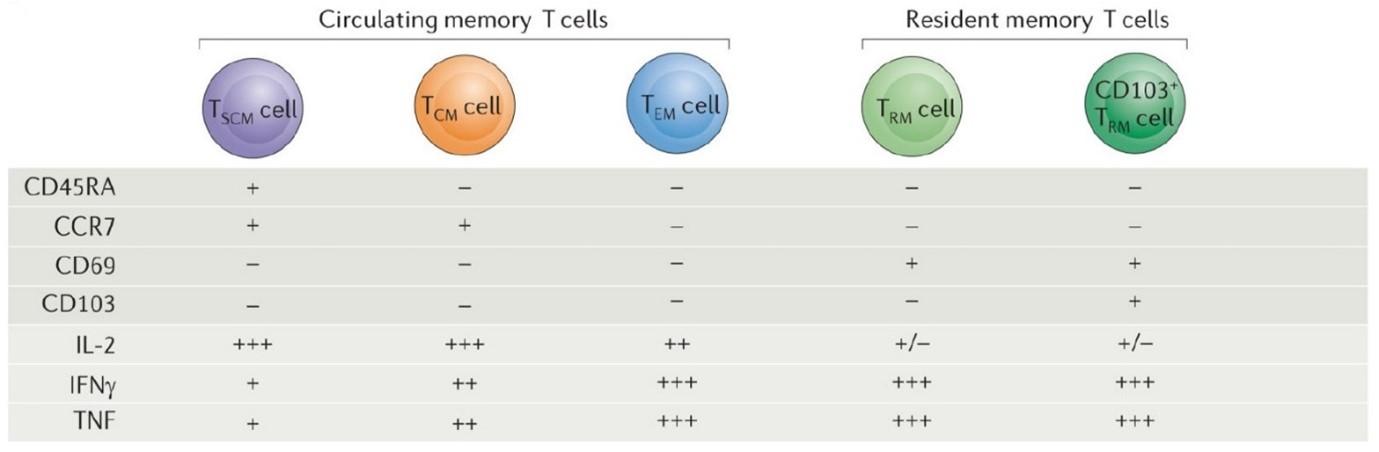 - Memory T cells in humans are identified by their expression of the CD45RO isoform and the lack of expression of the CD45RA isoform (CD45RO+CD45RA−) (Farber, Yudanin & Restifo, 2014). Naïve T cells express CCR7, reflecting their primary residence in lymphoid tissue, whereas memory T cells can be divided into CD45RA−CCR7+ central memory T (TCM) cells, which traffic to lymphoid tissues, and CD45RACCR7− effector memory T (TEM) cells, which can migrate to multiple peripheral tissue sites. Figure 5 would show the different markers that can be used to differentiate between these various subsets.