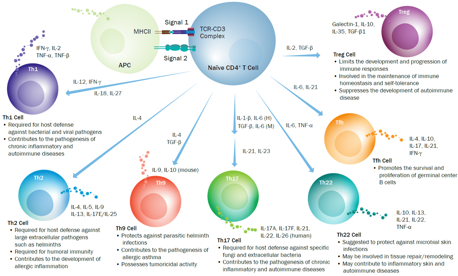 - The CD4 T-cells display helper activities on other populations of cells. Following the onset of T-cell activation naïve CD4+ T cells can differentiate into more specialized subsets such as T helper 1 (Th1), Th2, Th9, Th17, Th22 cells, follicular helper T (Tfh) cells, and regulatory T cells (Tregs) each with a characteristic profile of production cytokines, as shown in Fig 2
