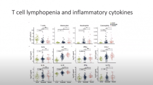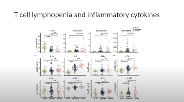 Following on from this, (IMPACT Yale study), they were able to develop a longitudinal immune phenotype in COVID-19 patients. They found (Figure 2), that circulating T cell numbers dropped in level in both moderate and severe patients with no accumulation in organs with an increase in monocytes, neutrophil, and eosinophil numbers in severe patients, in conjunction with an increase in inflammatory chemokines and cytokines. They were also able to show that specific cytokines positively correlate with viral load which is seen to increase in NP swabs in severe patients (Figure 3).