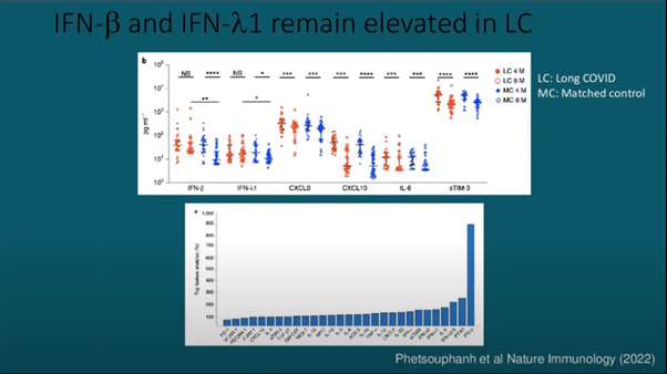 Following their investigations on acute COVID infection, they have started focusing on, as Prof. Akiko termed, a “parallel pandemic,” i.e., long covid. She highlighted that there are three paths to long COVID (Figure 5). It is known that long COVID causes lasting symptoms involving multiple organs. She also showed data illustrating how specific interferons remain elevated in long COVID patients (Figure 6). It was interesting to see that her group and others developed a model used to investigate how infection of the lung with COVID (mild infection), may lead to significant long-term CNS effects.